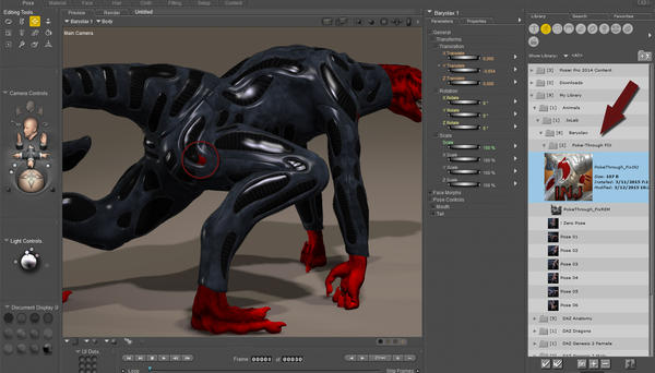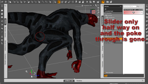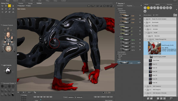 In Poser it’s almost the same thing. Once again, select Baryolax and go to the Pose section of the content library. Where the other Baryolax poses are installed you’ll see a Poke-Through FIX folder containing two PZ2 files, a PokeThrough_Fix injection pose and a PokeThrough_fix remover pose. With Baryolax still selected double click on the injection pose to add the PokeThrough_FIX slider. Just slide the dial to get rid of any poke throughs.