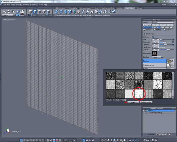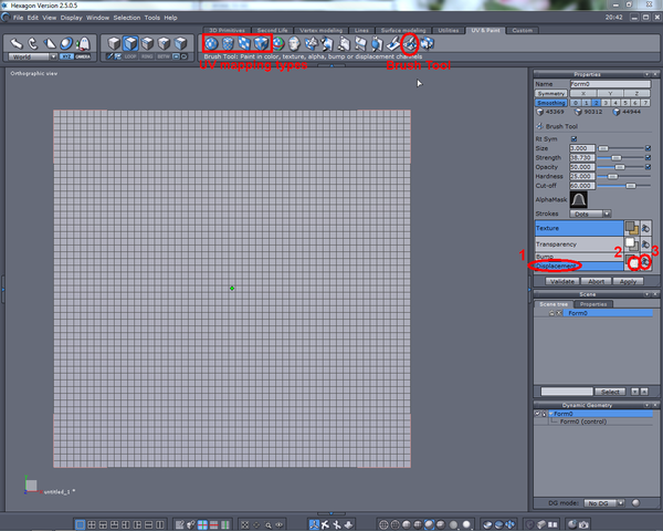 I could not find the old thread, so here are the images. To use displacement mapping (or texture mapping) the object must be UV mapped first. I don't explain how to do that here. I have used a flat grid as an example, but it will work with other objects.