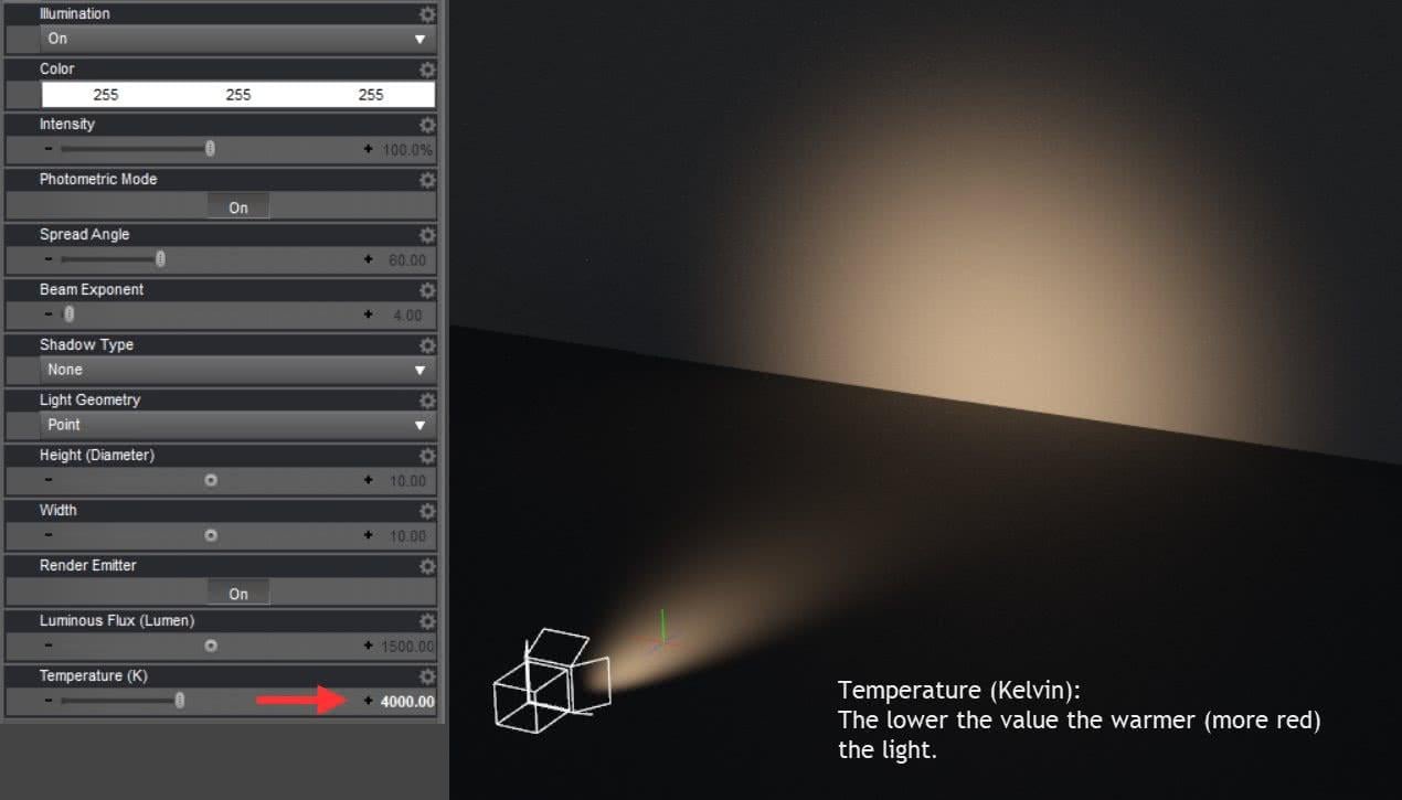 Luminous Flux: How bright the light is (this I use for brightness control) - Rule of thumb: A point light with 1500 Lumen is approximately a representation of a 100 watt light bulb; a candle flame has around 12 lumen. A spot light is "brighter" than a point light because it is concentrating the light into a specific direction.