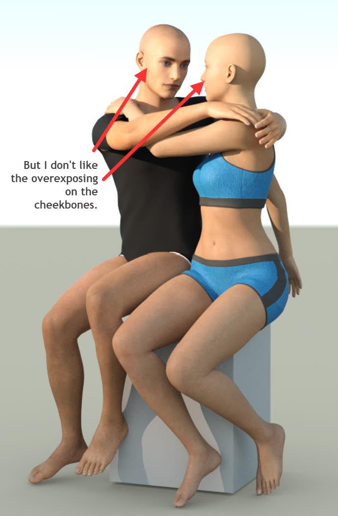 Here is a sample of the skin. I am happy with, again if I can render skin like the promos or even many free item render images on rendorosity I would be100 times more happy so I still do wish someone will help me get my renders the same but I don't get any advice that makes a difference, I guess for now In havegiven up and am thankful at least I finally like a skin style I can live with,  the only way I can the render the ful lscene half way decent is to use DOF enough, if there is no or little DOF then it probably will not too interesting. I ahve seen so many renders with no DOF, or very little, like the Organ room one user posted at my organ room question post, it is so crisp and clear, even with 3dlite, those renders also looks way more intersting than my iray renders do. If I rendered a scene of the organ room without some heavy DOF it would really look like a big flat mush, not beautifully crisp.   I also have to be careful to only use products that render good many, especially those with water or grass or most any ground or buildings do not fool the eye for one second that it is a 3d world as the promo images do. Many times I buy stuff only to find that it doesn't look top good when I render it. Becasue of this I only use 15-20% of the tons of stuff I bought from daz or rendorosity, I have a disease, since I love color and color depth so much when I see a great render I sometimes can't resist to buy that product, the disease is my  mind doesn't logically tell me "remermber what happened last time that another purchase didn't render too good-dont keep buying more and more stuff thinking that will change the look the render" no matter what it is svery hard for me to resist to buy things, at least I have the patience usually to wait until they go on a big sale.