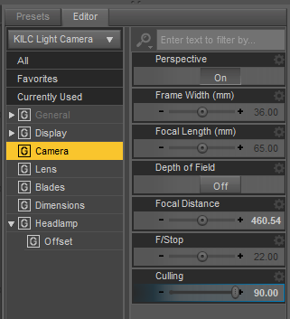 The camera itself is just set up like a default Daz camera as far as I can see, but it's got section planes parented to it that you can move anywhere in your scene. Geometry on the outward facing side of the section planes will be treated as invisible in the scene.