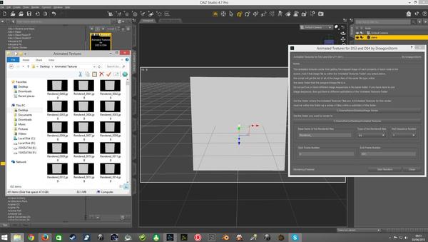 The Constraints: Animated textures must be sequential files named in alpha order. All sequential texture sets must be within their own folders. All sequential texture folders must be located in the same folder for the current render set. The texture sequences are not keyframed, so if you change the starting frame number, the textures will not set to then advanced sequence. You will need to set that up before starting the script, if necessary. (Note: this script renders out its own animation sequence renders, for you to use to create an animate file use something like VirtualDub(Free), Adobe After Effect, or Sony Vegas (to list a few) to assist in the creation of animated texture images. You will not see the textures change while reviewing in the DS Timeline)