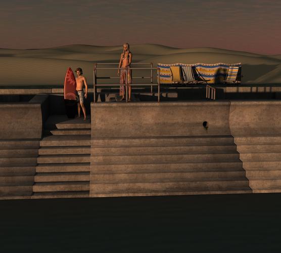 I'm still fiddling with the poses and colors; any advice would be appreciated, especially regarding lighting and how to create tire tracks and footprints in the sand.