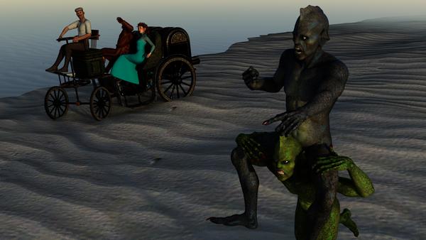 Racing, Chasing, or Fleeing? When these Fishpeople and colonists saw each other on the beach, everyone started running or driving, and nobody's sure quite what they're doing.