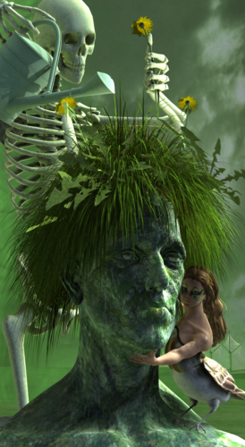 The piece seems to be about a giant green guy. I am not sure why the skeleton is there, other than to water the plants on the stone guy's head. Yes, death, but death is strangely giving life (water) this time, so I don't get that.