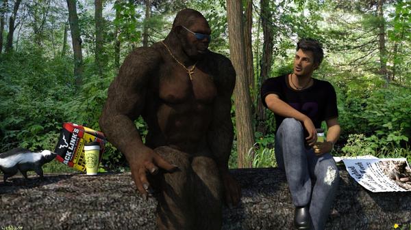TBH I think all of the small prop additions and extending the image to include them are distracting and take away the focus on the man and bigfoot just chatting. Cute, but becoming cluttered and side stories not needed.