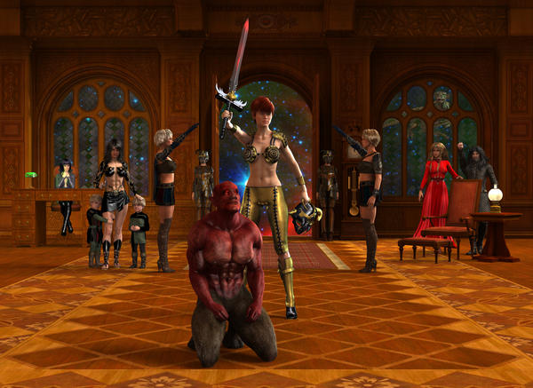 I think that "throne" is a bit too dark, at leas on my screens its just a black blotch. The woman on the left side of your render, I believe she is the original the other one is copied from, has a weird stance, I guess the high heel pose ist still on, and I would think the hand on the bosses shoulder should rather have the fingers to the viewer.