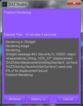 After rendering a simple scene with just one prop, this error keeps generating; done the usual from restarting daz to rebooting the machine; looked over cameras and lights, and even cleared the Temp directory too. Also switched props/figures and I'm getting the same results. Not sure what to do with it, anyone out there run into this one too? Looked through forum and did not find a direct match. Any help is appreciated!