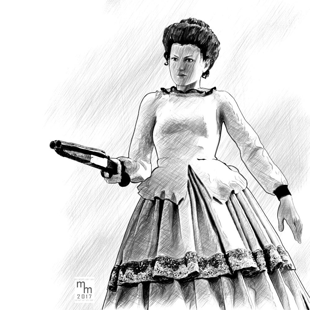 I'm going to revisit this illustration over the weekend. I need to adjust the pose a little (I don't like her hand just hanging there) and simplify the ruffle/lace on her dress, and lighten the cuffs. I will also probably tweak the lighting to something more dramatic.