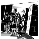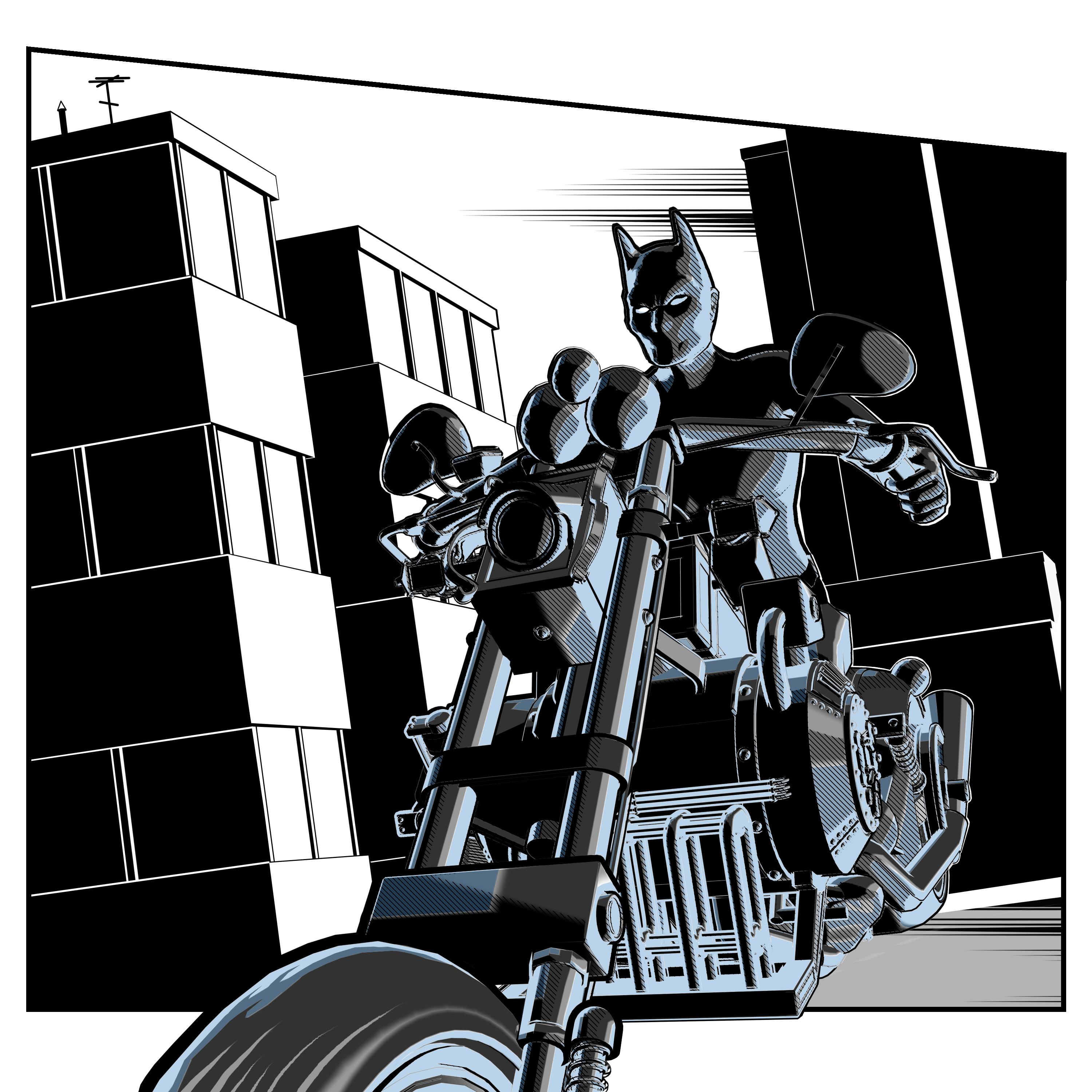Here's my noir comic technique with (and without) a pop of color (done VERY fast, so it's far from perfect). This is from a panel of the comic that I'm probably not going to use, so I haven't added any tailpipe exhaust or finished cleaning it up. There's nothing "wrong" with this panel, but it doesn't fit the storytelling requirements for this page. I need to use a long shot to establish the look of the city, and there's a close up of him on the cycle on the next page, so having this panel would just make the next page repetitive. Nevertheless, this might make it into another story, sometime, so I'm not tossing it out. And it makes a neat spot illustration.