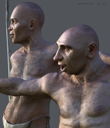 Again, there's some great looking stuff going on here. This is my take on skin again, using my stone age buddies. Rendered at gamma 1 with customised textures changed to gamma 2.2 in PS. I've dumped the head hair for now while I customise in Softimage. Both figures have internal bodies that block the SSS transmission where (kind of) appropriate, but theoretically allow light to wrap around through the soft tissue. Though subtle, it did make a difference, but I'll also be trying out SSS transparency maps.