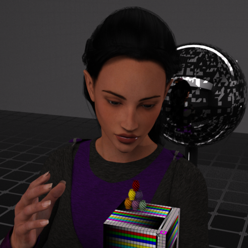 I decided to try a side shot, to see a bit of light threw the hair. Face palm, those accent lights don't make all the light in the room, and are not all that bright. I just went with the light brightness ratios I had with 3delight, and adjusted them all in kind. I need to fix that some day.