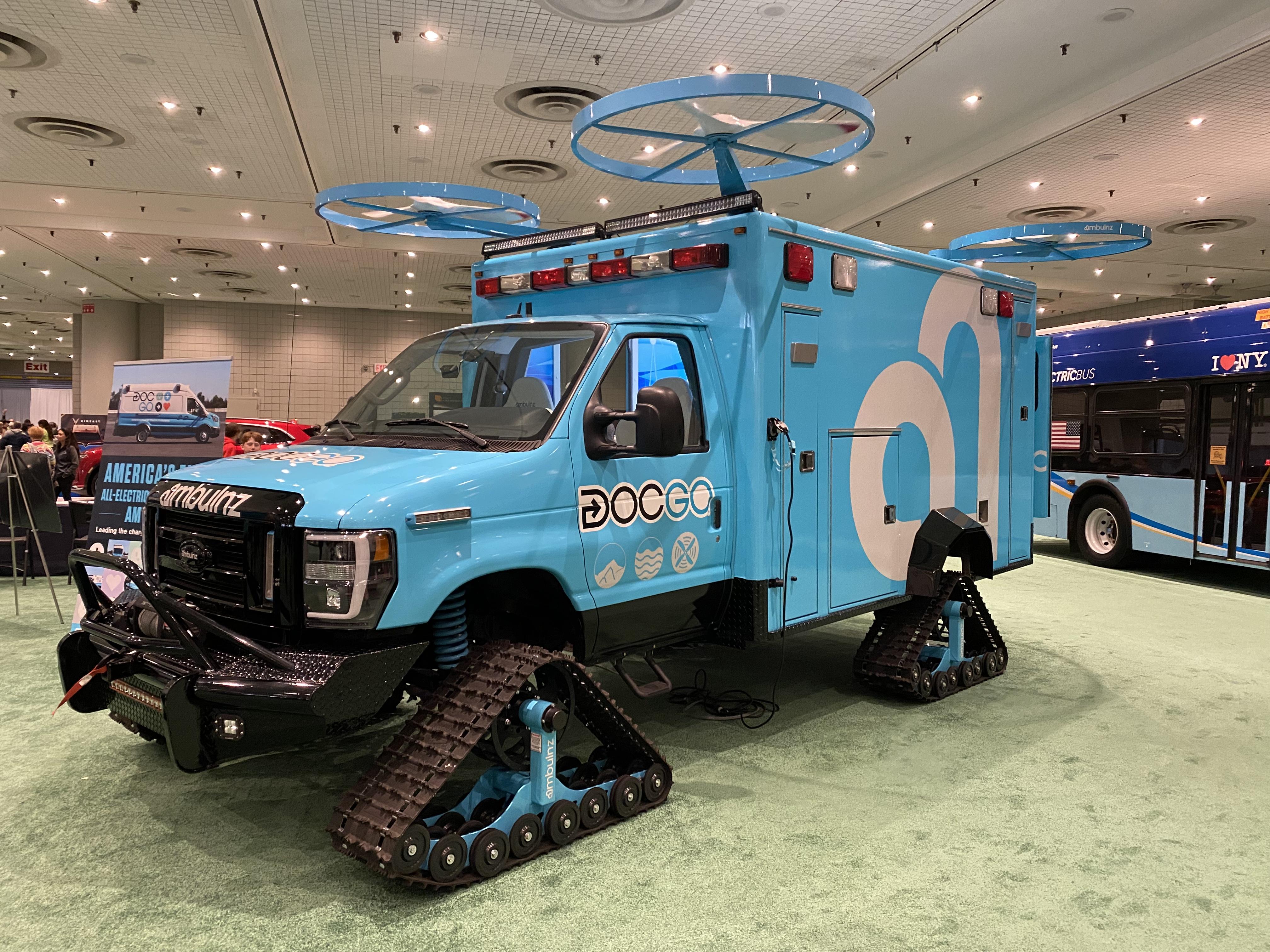 It's very confusing because the vehicle is sort of a nonfunctional promotional piece for an Uber-like gig-economy Ambulance company and a buzzword based "on-the-ground mobile medical service" (whatever the hell that is)... the interior of the vehicle is spartan ambulanceish setup, with a huge monitor playing a weird promo video pretending it's taking place in the future where apparently the laws of physics no longer exist and ambulances with tiny fans on the roof can fly and everyone speaks in buzzwords and is happy to need an ambulance.