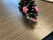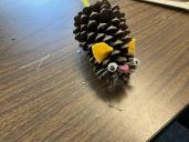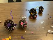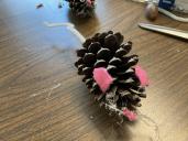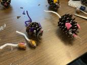 I made some mice out of pine cones, felt, pipe cleaners, googly eyes and fish line.  I put them all together with hot glue gun.