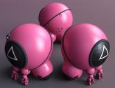 The bot was looking like an octopus with the shape, but I had no plans to do 8 legs. Then I made the Squid Game style texture map because my mind free associates way too much, and I liked it enough to keep it. But I was more inspired by the Tachikoma from Ghost in the Shell so I was going for a more police style crowd control deal. So that's what happened.