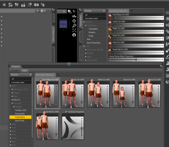 For me only the Petite Gn AMR item appears on the Shape Pane under Universal > Proportions with Genesis selected. They all appear on the Parameter’s pane under Actor > Universal > Proportions. I have uninstalled, re-installed, reset the Content DB Maintenence, and re-imported metadata. I have the latest version (Proportions_Gn_2011081901), but it was happening with an older version (Proportions_Gn_2011081901) as well. There's probably a simple explanation, but I am not seeing it.