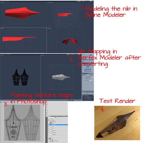 I converted the nib to a vertex model so I could UV map it and painted a quick mask design in Photoshop to use as mask for a multi-channel mixer and (blurred) as a bump map. My UV map is stretched out a bit so my painted map came in a little stretched out too - I'll have to fix that but I'm happy with how it's looking so far.