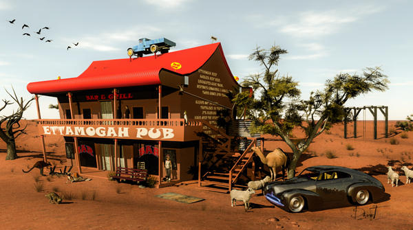 continuing on with my Wondrous Australiana theme here is the Ettamogah Pub a wondrous iconic toon pub now found in several places around Oz.. created and rendered in Cararra 8.5Pro