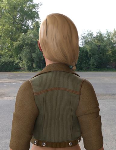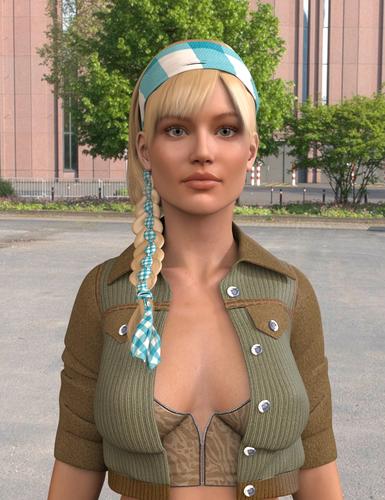 The fabrics look awesome (even though the texture artist seems not to have tiled the leather texture finely enough), as does the girl in both this and the next post. That braid looks challenging, though. Could you please post results if you do manage to make it look like hair? These 'solid' hairpieces are so tough to set up convincingly...