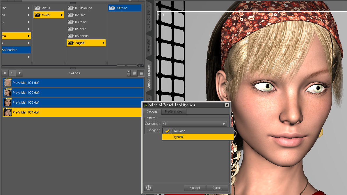 Simply turning Sub Surface off doesn't help much at all on AoA, especially with some shaders using Sub Surface heavy skin tinting (Diffuse strength under 50%). Thankfully, some PAs appear to have stuck with a consistent shader setting envelope of sorts, and do most of the variation between figures on the maps for that figure. So I can make a single "Alt Shader" for the newer FWSA figures (for example), and use that same "Alt Shader" on almost all the FWSA figures. I just click the Alt Shader preset while holding the 'Ctrl' key, and next to 'Images' select "Ignore" in the window that comes up.