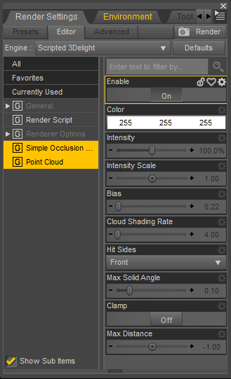 The settings have been covered elsewhere i think. Intensity, intensity scale, color, max distance and bias is the same as in many ambient occlusion lights. You generally want cloud shading rate above 4. I believe it is recommended to use clamp and set hitsides to front and back. As for max solid angle, Pixar recommends a value of 0.03 to 0.1.