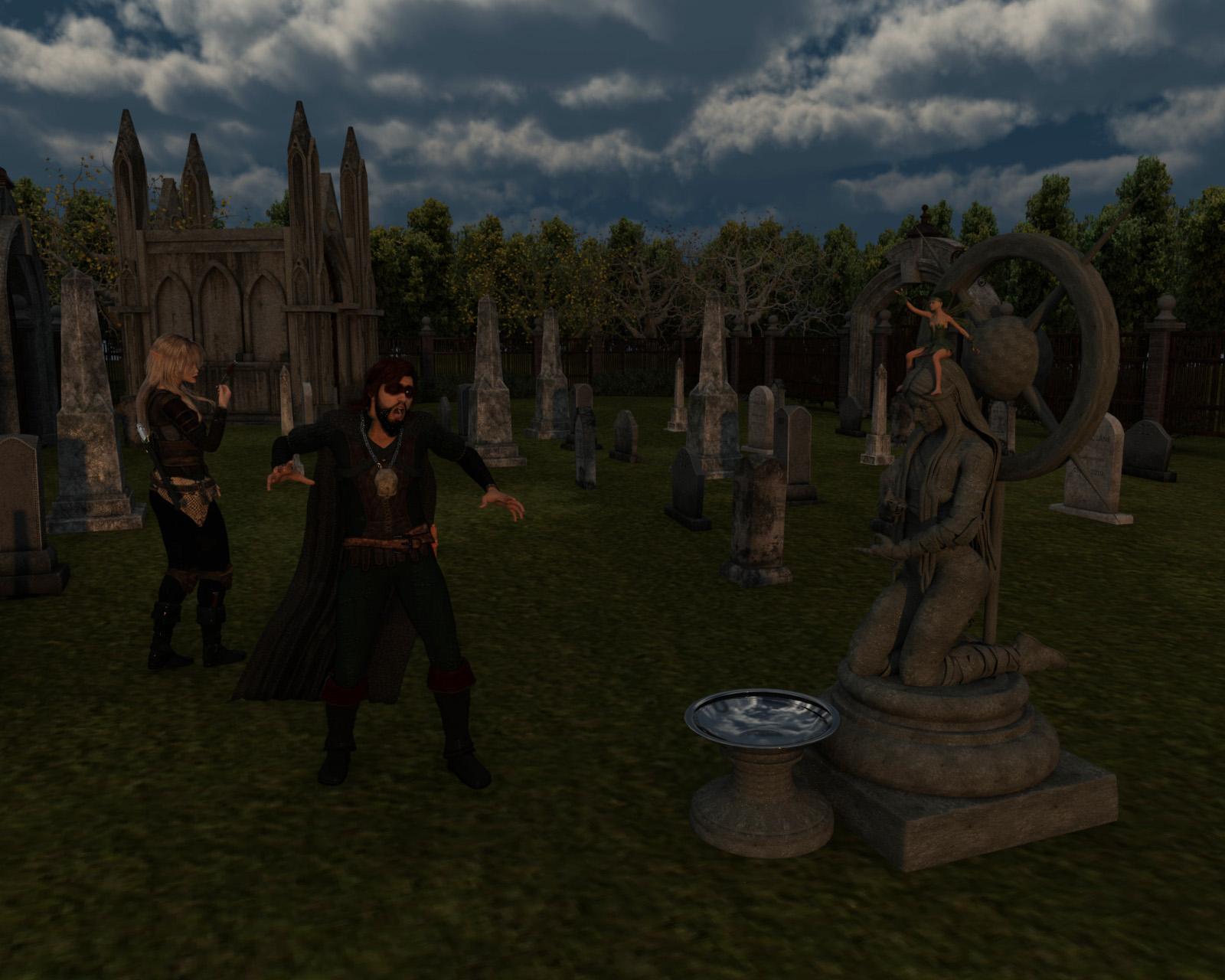 In the Cemetery is a statue of Selûne, Goddess of the moon. Suddenly the moon turns full, and spreads its light over the cemetery, and Ater’s little friend warns him: - “Something terrible will happen!”. A little fairy with green hair appears on the head of the Selûne statue, and speaks with an extremely powerful and loud voice: - “I smite thee creature of the Abyss!” She casts a spell and something rat like becomes visible in the grass.