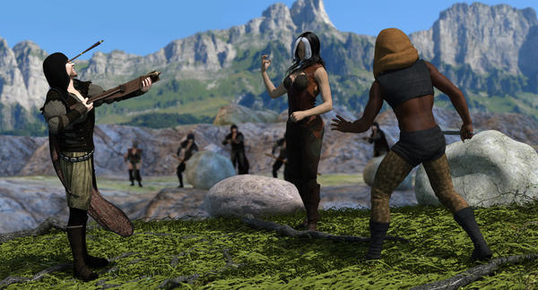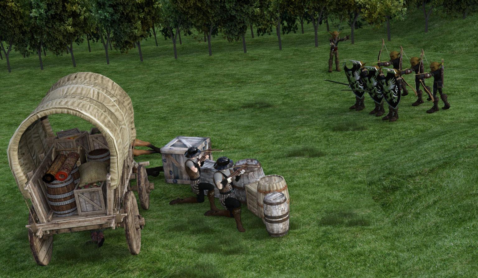 Celthor is scouting about an hour ahead of the caravan to spot any problems, and Ulfnaar being kind of bored by the slow pace of the caravan joins him. The lass into a more greener land with low hills, and suddenly they spot a lonely wagon. Crates and barrels and two men with crossbows defending against a group of seven hobgoblins. The hobgoblins just stepped up with shield cover, fired bows and went around to try from the other side, looking more like a training than actual combat, but they did hit one of the defenders. Under the wagon was a third person laying, and in front of the wagon lies a dead horse. Ulfnaar looked at Celthor who raised his bow.