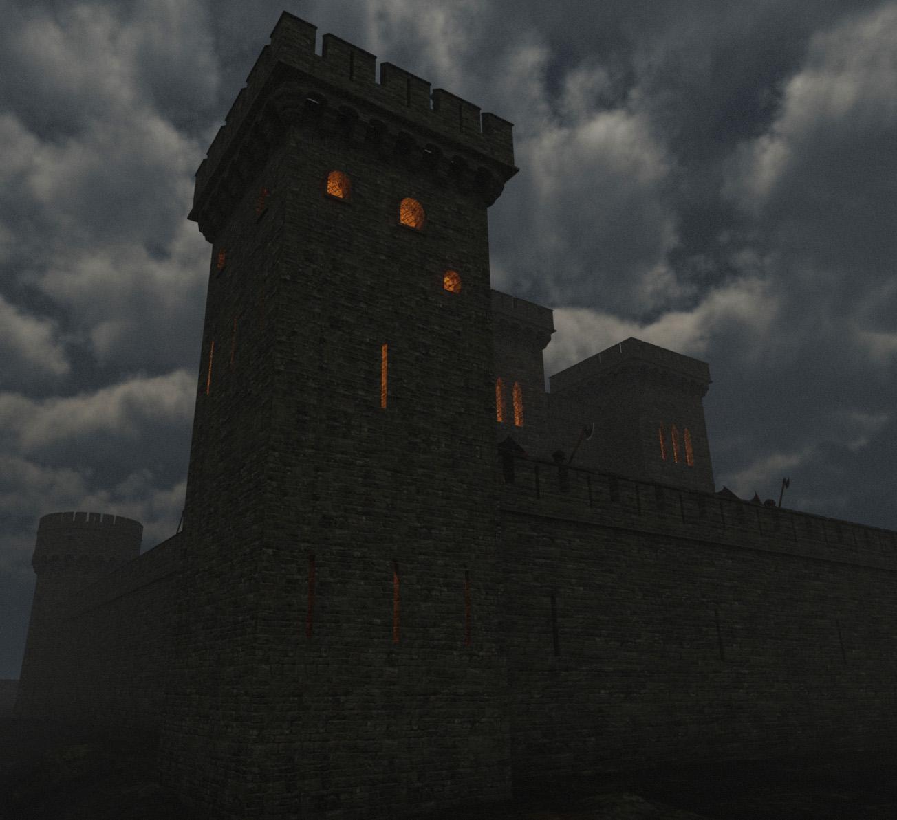 The group decides to leave the peaceful cemetery and scout around the castle. When they leave the sacred grounds, the full moon is no longer visible, only a sharp of the moon is, as it was before they met Spivey the fairy. The castle is located on a cliff close to the water, with dense forest on one side. It looks in good shape, and light from the windows suggests it is occupied. Merisiel and Celthor scouts closer and around the castle, and sees guards on the walls.