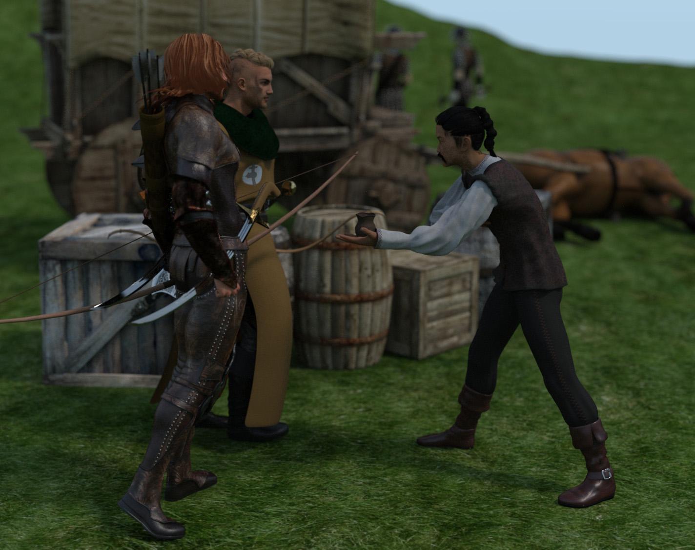 The man under the caravan stands up, he wasn’t dead, just hiding. Celthor and Ulfnaar walks down to the wagon, and Ulfnaar says: - “Celthor, this bow thing, they work very well don’t they? I hit three hobgoblins in the eye, did you?”
