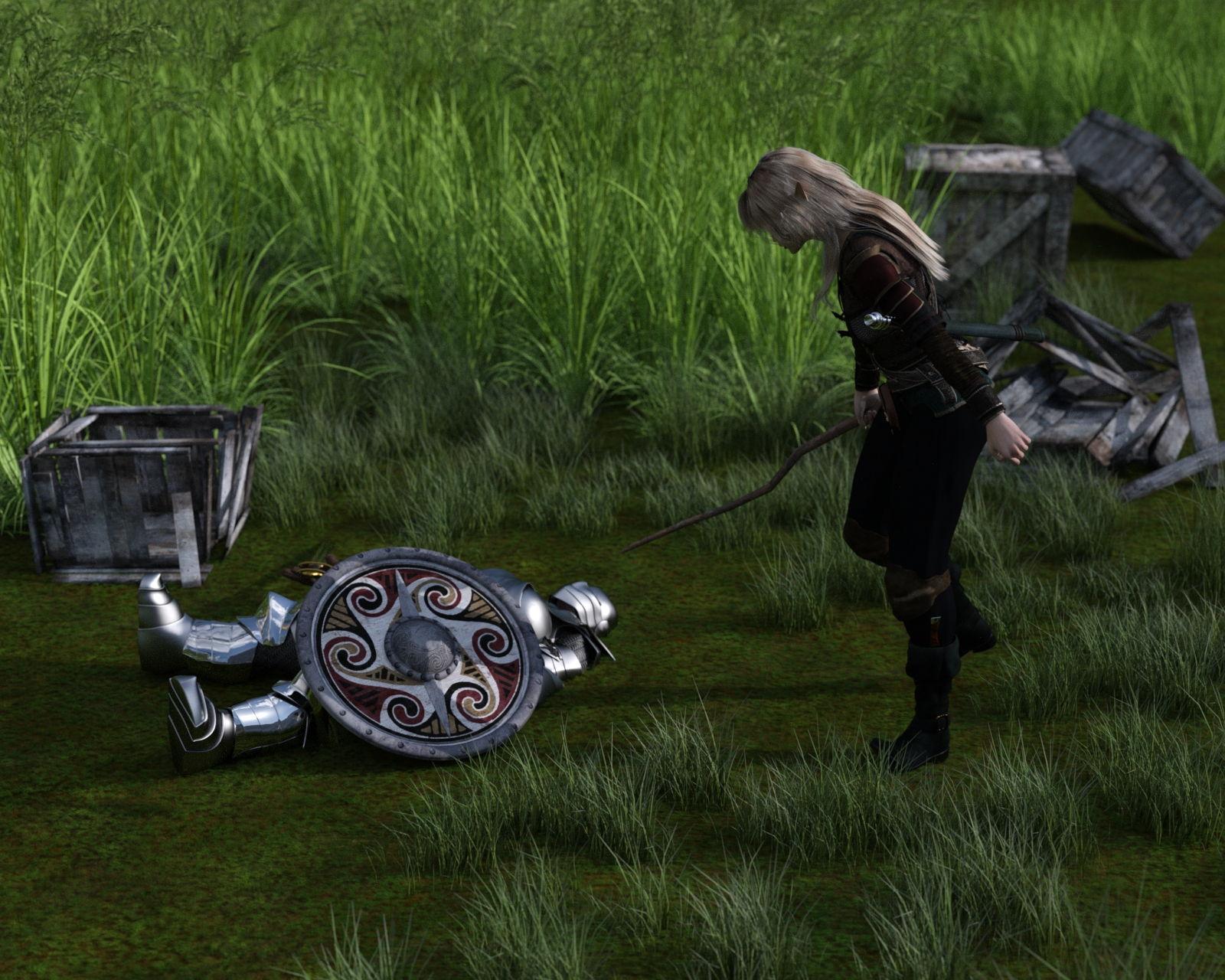 She finds the remains of a camp, trashed boxes and wagons, and a burnt down tent. Suddenly she hears a sound, she looks closer to the grass edge, something is there, something shiny. Careful as she is, and cunning, she pokes that with a stick to see if it is alive.