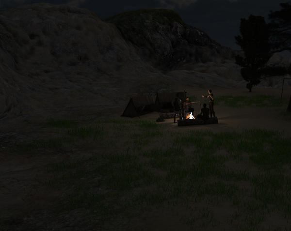 On the evening the second day, they all smell smoke from a fire in the air. They looked around, and saw a flickering light i the distance, about a half mile away. Merisiel decided to scout the situation. She quickly and silently disappeared into the darkness and the high grass, and she was gone a good while before coming back. She reported that it was a camp, most probably stragglers from the main force. It was two small tents and four humans around the campfire, and a bit away from them was another tent with a group of Kobolds. The men was in a long dispute, arguing about the best way to grill a prairie hen. Merisiel said she decided to let them live, and that the group should move quickly around them and far enough not to get any nasty surprises.