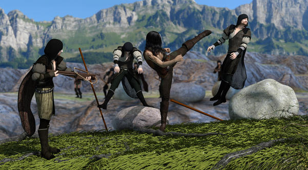 The crossbowmen on the cliff on the other side of the road fires and one hits Ater, the other bolts barely missed Garnek, who is falling off his horse, or gracefully dodging, depends who you ask. ASter casts a sleep spell on the hill where there still are enemies and two of the mercenary bandits falls asleep. Merisiel and Ulfnaar jump off their horses and starts to rush. Merisiel who is fast as a leopard reaches the hill and kills one bandit. Ameiko sees that one of the ambushers on the other side is running away and she makes a jump over the chasm and rushes to him. She sees that he is putting a horn to his mouth and he makes a sound right before Ameiko stops him with a well placed foot.