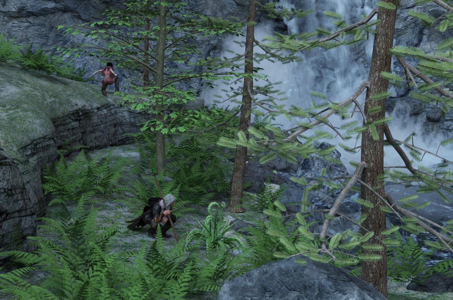 The group continues through the thick vegetation, so think it’s almost impossible to see more than a few yards ahead. Suddenly they hear the sound of falling water, and they arrive to a pool of water with a waterfall in the far end, coming down from a high rock side. Linnaril asks a plant if a dragon has been here, and the plant telepathically sends him feelings of a frightful beast. Ameiko scouts ahead and in behind the waterfall, there is a dark tunnel.