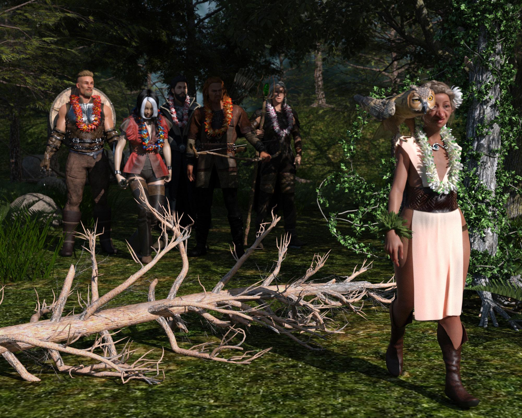 Suddenly, there is a sound of a falling tree, and a woman, with a gnomish accent, screams for help. Ameiko, who was first in the line, ran forward and saw an old gnomish lady under a tree. She used all her strength to lift the tree to free the woman, and when the tree came up a little bit, it stood up by its own force. The woman, having strange flowers in her hair, took a flower from her hair, that Ameiko was sure was not there before, and then spun a whole lei from it and put it around Ameiko’s neck saying thank you. The rest of the group catches up, and everyone is given a lei, then the little gnome lady walks away, with an owl on her shoulder, and the fallen tree that now stands up, and some other trees, walks away with her. The Jade Wardens looked at each other, that was a very strange experience. Ater detects that the leis are magical. Linnaril says that she was a druid, a quite eccentric druid though.