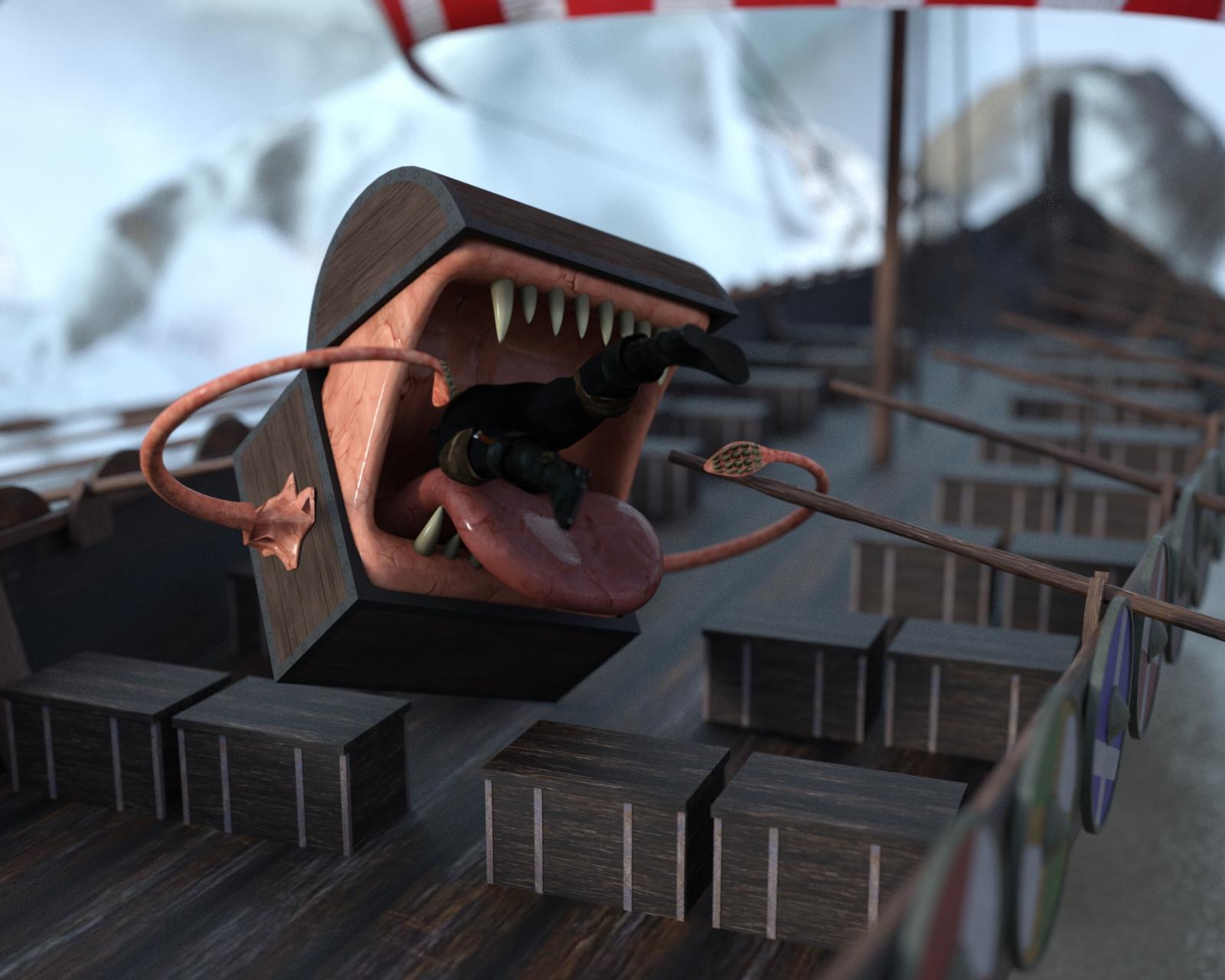 On the ship was a huge chest, and Ulfnaar called for the chest expert Merisiel, who danced aboard the ship, when she carefully examined the chest for traps, hearing her heart pounding in her chest, she was quite surprised when she heard another sound, a soft beathring from the chest, the seconds before the mimic attacked her. She quite quickly took care of the beast, before Ulfnaar or Kelda had a chance to help her.