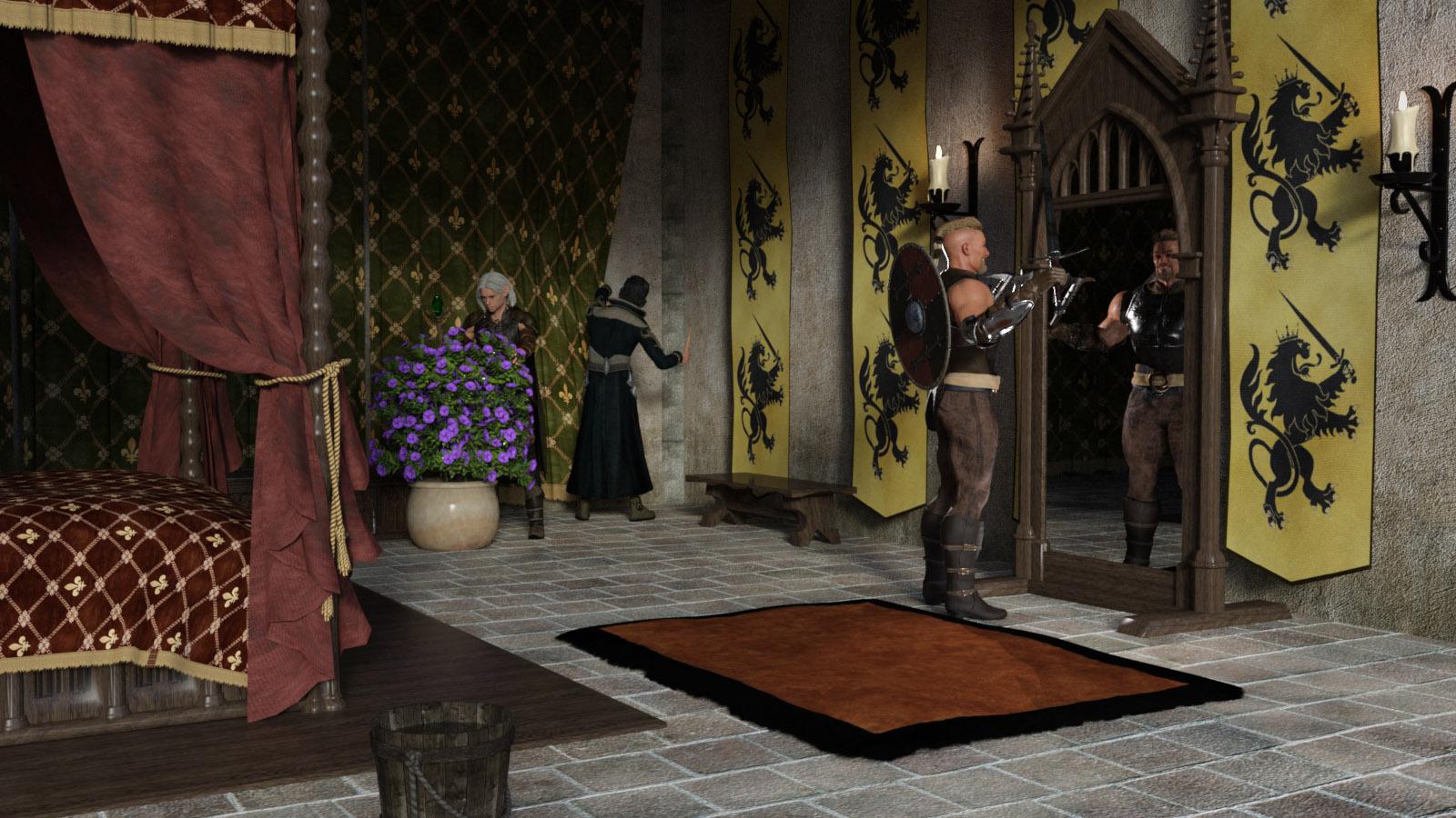 The expedition goes on passing a well stocked food storage, and then the private chamber of Neronvain, a lush room with tapestries on the walls, carpets and a very nice bed, and a large mirror. While the others looked for things, Ulfnaar posed in front of the mirror, he liked his new massive muscles.