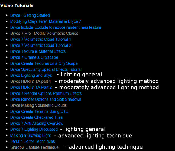 I've indicated which of my old video tutorials relate to lighting. And also how tricky I consider them to be.