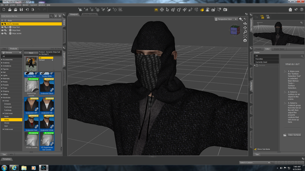 a):After applying the clothes I get what is pictured in the screen shot below, namely; the ears are sticking out of the sides of the mask (both sides) and the mask eye hole area is covering up too much of his eyes, the lower part of the mask should be down a hair but I find no way to do that, I've tried everything I could think of, at least in my limited knowledge concerning such problems. scaling the mask in any way just makes it look stupid in several different ways.