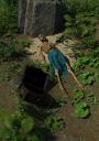 Only used the maps from the decals.  Applied to another terrain using the layer's list shader.  This terrain is also by Andrey - the terrain map is called slime from Nature - Swamp, which is probably pretty old because it was in the Poser-format content library.  Only chose it to have something to test on.  Used Carrara's layer pen tool in the shader room to place the decal in one corner of the terrain.
