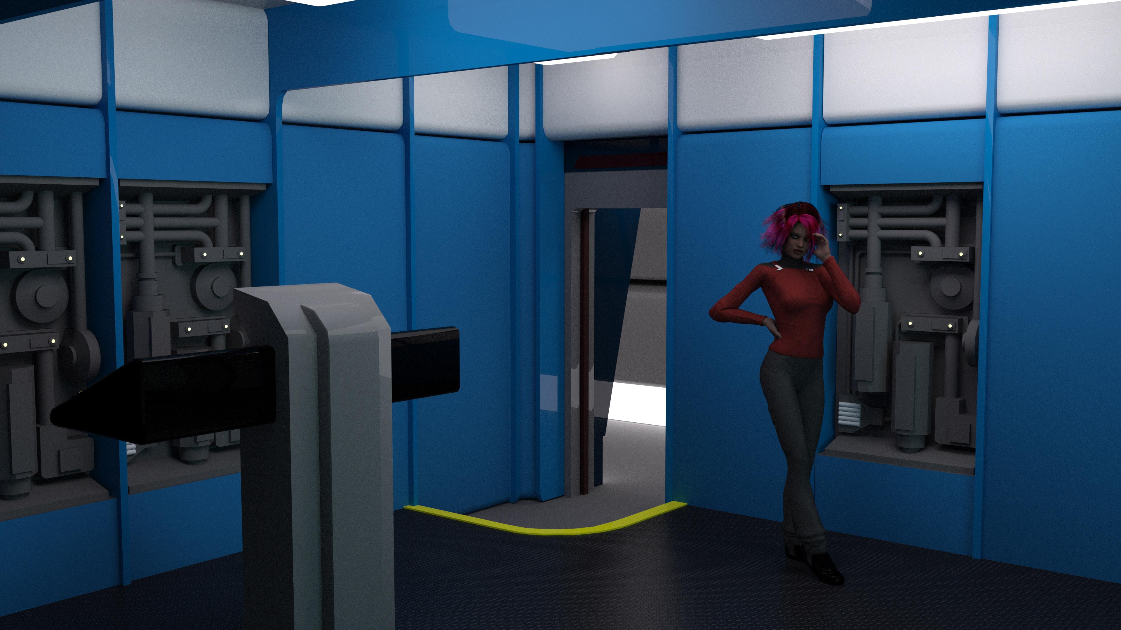 Re-renders of the Destroyer Transporter Room. Made some changes. Added in a new console to replace the TMP style one with something in between. Added floor textures to the raised floor and a safety thing so visiting Admirals don't trip, changed out the outside corridor to the Destroyer Radial Corridor, and now I'm ready to work on the other side of the room. ;)