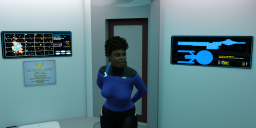 So, here she is looking much more Star Fleet standing on my Enterprise A bridge with blue accent coloring.