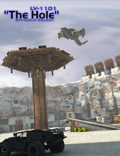 I give you LV-1101, the "Hole". A new off-world colony with plenty to do. Set-up for Poser, DAZ Studio 3Delight, and DAZ Studio iRay. iRay includes both a daytime and nighttime scene.