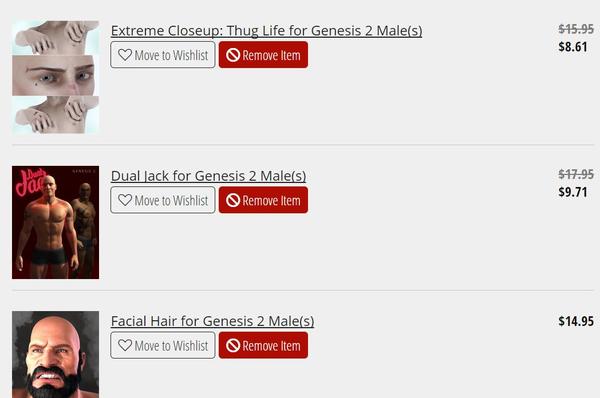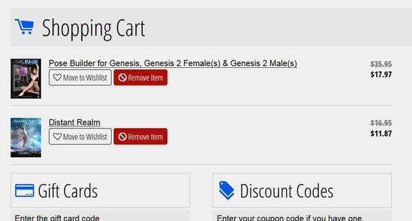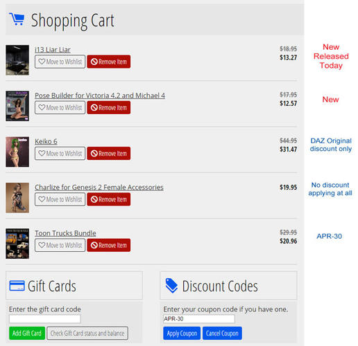 As shown, Keiko only gets the expected 30% off DO discount. The April Showers discount doesn't apply to this item. I assume that's because it's already being discounted. What's puzzling is why the April Showers discount isn't applying to 3D Universe's Charlize Accessories. It isn't new and isn't involved in any other sales. Finally, 3djoji's Toon Trucks Bundle is receiving the April Showers discount -- which shows that the discount is indeed applying to the cart.