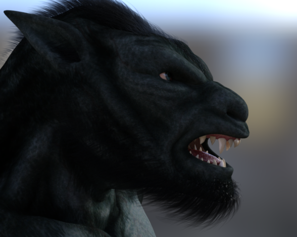 Nothing special. Genesis+MS Lycan. Tried a suggestion by Hellboy to use the wax shader on the hair. Saved out a basic, mapless starting point for Iray skin and tweaked from there (G2F + script to rename surface zones and saved it out to use on previous gen chars). Also tweaked the Lycan's head z-scale to elongate it a bit and moved the upper/lower jaw nodes to compensate.
