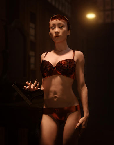 Thanks! I used a photometric spotlight for the main overhead lighting. Two more spotlights were used also, one small very dim one from near the camera's position to get a reflection in the eyes, and one shining on the background to add a tiny bit of illumination to the background props. I wanted the background to be dark, but not pitch black. Also, I have an HDRI for some ambient light but it is turned down so low it is contributing almost nothing. And the background prop model had a lamp near the ceiling, so I used an emissive Iray shader on it to make it glow. Light bloom (essential for realism I think) was then added in Photoshop, since I have more control there than with the Iray bloom effect.