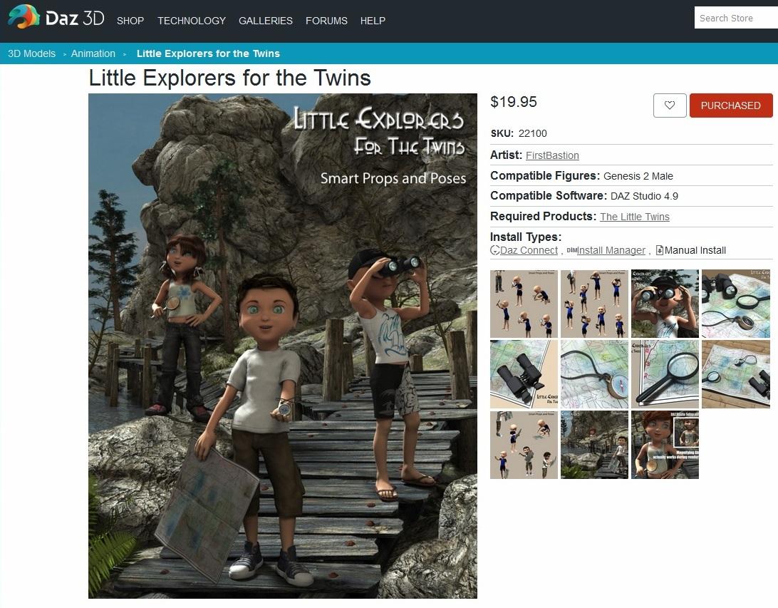 I thought they looked fantastic and potentially a very versatile addition to the Genesis2 gene pool, and decided to support the release with a smartprops and poses set that works with the Twins. Little Explorers. Binoculars, unfolded map, compass, magnifying glass are also regular props too, and load separately as well as tabletop clutter. Keep an eye out. Coming soon.