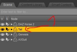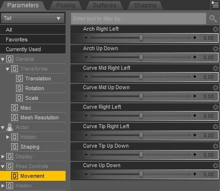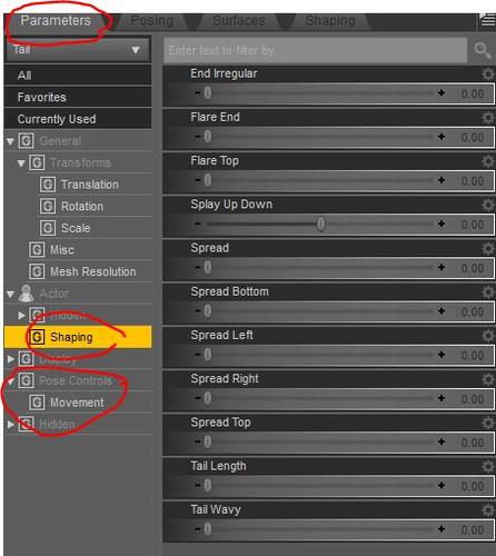 Some also have built-in morphs that can be accessed through sliders in the Prameter/Shaping tab. To access them, you first have to select the item you want to manipulate in the scene tab - in this case the tail (Marked with (1) in the second image). After you select the tail, go to the Parameter tab (If you don't see it, activate it under Windows --> Panes).