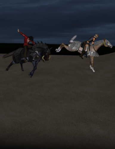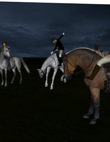 I recently bought the DAZ horse pro bundle because it was on a major special ($22 USD!) and I'm doing really well with bridleless and riderless renders - I'm a natural horsemanship rider, and I don't really do bits. But I wanted to do a render with a nasty girl from a book I'm writing, and I have everything sorted - skinny little white bucking pony, riding gear, crop, blah - but I don't know how to pose the rider's hands on the reins. Someone help, please? I'm using Genesis with the DAZ horse.