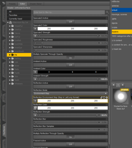 Ok, here's a super easy question. I'm certainly missing something obvious. I'm trying to get a reflection (a fake one, I don't have anything real to reflect) in the Millennium big cat (version 1)'s eyes... but it's not working. What might I be missing?