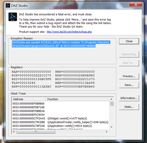 Unfortunately, once again, something went wrong and I got an error message as I was adding morphs to the GenX tab to be added to Genesis. When it happened, DAZ completely shut down, and the message popped up. I tried restarting my computer, and doing the transfer again, but the same thing happened again, with the same message. Is this plugin cursed or is it just me???